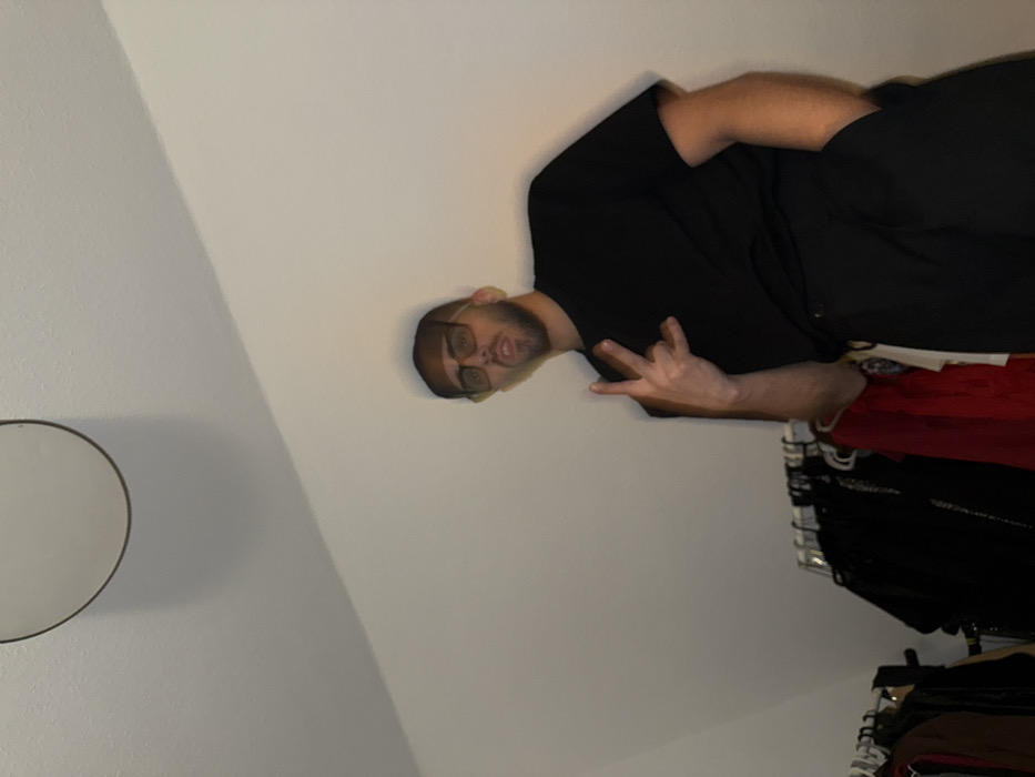 A person with glasses and a black shirt gives a peace sign. The person is against a white wall with a hanging mirror and a clothing rack full of garments. The wall creates a slight shadow in the lower left. The individual seems to be inside a room, perhaps a bedroom or closet space.