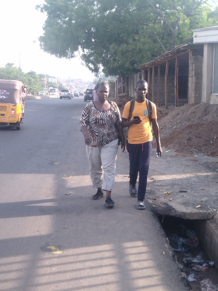 Two people, a woman and a young man, are walking along a paved road in New Karu, Nigeria, a city located at latitude: 8