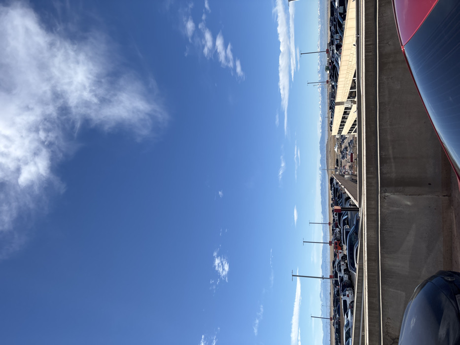 A bright blue sky with scattered white clouds dominates the view. Below, long rows of parked cars stretch into the distance, separated by rows of tall light poles. A long, low mountain range is visible on the horizon. A concrete wall runs along the right edge of the frame, with parts of two vehicles in the foreground adding depth.