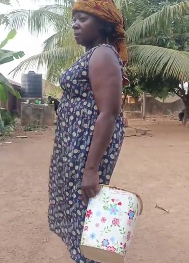 A woman is standing outside holding a flower-patterned bucket. She is wearing a blue and white printed dress, a patterned headscarf, and sandals. She is standing on a dirt patch. In the background, there is a water tank, a building, and palm trees. The woman is looking to the side.