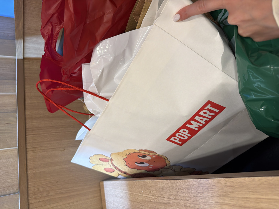 An indoor scene in Wichit, Thailand, displays multiple shopping bags. A white paper shopping bag, featuring red rope handles and the prominent red text "POP MART," occupies the central foreground. A cartoon character, depicted with an orange body and a fluffy white head with ears, is partially visible on the left side of this bag. Behind the white bag, a crumpled red plastic bag is visible, along with a white plastic bag. A portion of a green plastic bag is present in the lower right. A human hand, with an index finger displaying white nail polish, is positioned in the lower right, making contact with the white POP MART bag. The background consists of light brown wooden wall paneling with horizontal and vertical seams.