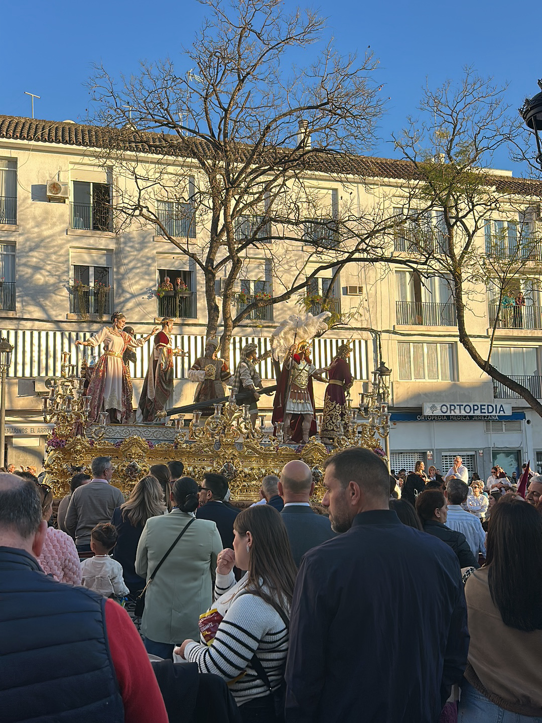 The image captures a religious procession in Jerez de la Frontera, Spain, likely during Holy Week. A large crowd of spectators surrounds a highly ornate float carrying figures depicting a biblical scene. The figures on the float are dressed in period costumes, and the float itself is decorated with intricate gold or gilded elements. A building with striped awnings and the word "ORTOPEDIA" is visible in the background, indicating a commercial establishment. Bare branches of a tree frame the float and the building behind it. The sky is clear and bright, suggesting a sunny day. The focus is on the religious procession and the assembled crowd.