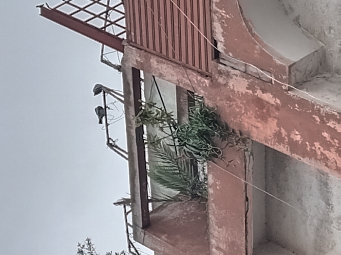 This image depicts an upper section of an urban structure in Casablanca, Morocco, likely a rooftop or balcony area, viewed against an overcast sky. The primary structure is a reddish-brown, weathered concrete or stucco facade showing extensive peeling paint and discoloration. A prominent horizontal beam, also reddish-brown and faded, spans the middle of the frame. Above this beam, a dark-colored metal framework, possibly a trellis or old antenna support, is visible. Two dark-feathered pigeons are perched on this metal framework towards the center-right. Various wires are loosely draped across the metal structure. Below the main horizontal beam, a lighter-colored wall, possibly concrete or plaster, exhibits cracks and uneven texture. Green vegetation, including a large palm frond and several smaller leafy vines, grows from behind and drapes over the horizontal beam. To the far right, a diagonal reddish-brown element with a decorative lattice pattern is partially visible, suggesting part of a roofline or upper balcony railing. A segment of a white-painted archway is visible in the lower right corner. A thin white string or wire extends diagonally downwards from the left side of the structure. The sky is a uniform light gray, indicating overcast conditions.