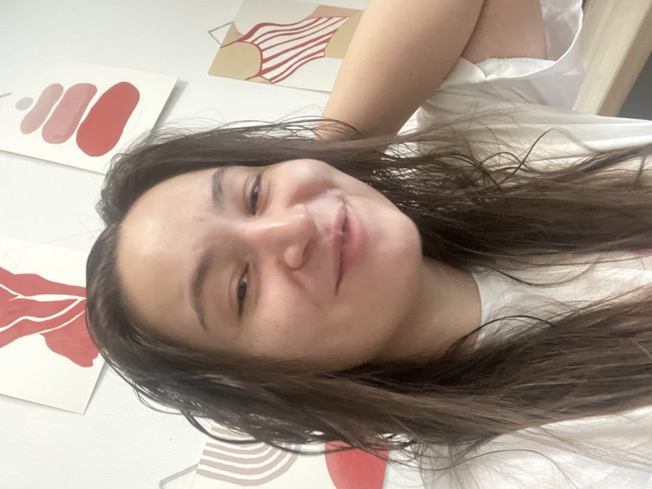 A woman is seen in a selfie, facing slightly off-center, with a soft smile. Her brown hair is parted and appears slightly damp. She wears a white t-shirt. In the background, several art pieces are visible on a wall, featuring abstract shapes and patterns in shades of red and beige. The lighting is bright, and the overall image has a casual, candid feel.