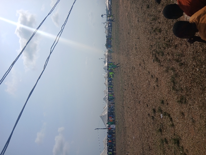 The image depicts an outdoor event in Epe, Nigeria, under a bright, partly cloudy sky with a visible sunburst. In the foreground, two young individuals, seen from behind, wear a yellow shirt and an orange-red shirt, observing the scene. The midground presents an expansive, dry, brown field characterized by sparse grass and scattered debris. Numerous people are present across this area; many wear bright green or neon yellow sports jerseys, with some actively moving on the field, indicating a sporting event. A substantial gathering of additional individuals is visible behind the active participants. The background features a long, uniform line of white peaked canopy tents, with more people visible beyond them. Two dark, parallel electrical or communication cables span diagonally across the upper portion of the sky.