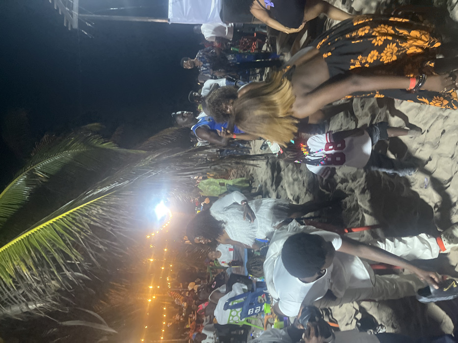 A nighttime beach gathering is in progress, illuminated by strung lights. People are standing and seated on the sand. Some are dressed in white, others in patterned outfits. There is a couple dancing in the foreground. A palm tree frond is visible on the left. The overall atmosphere appears festive.