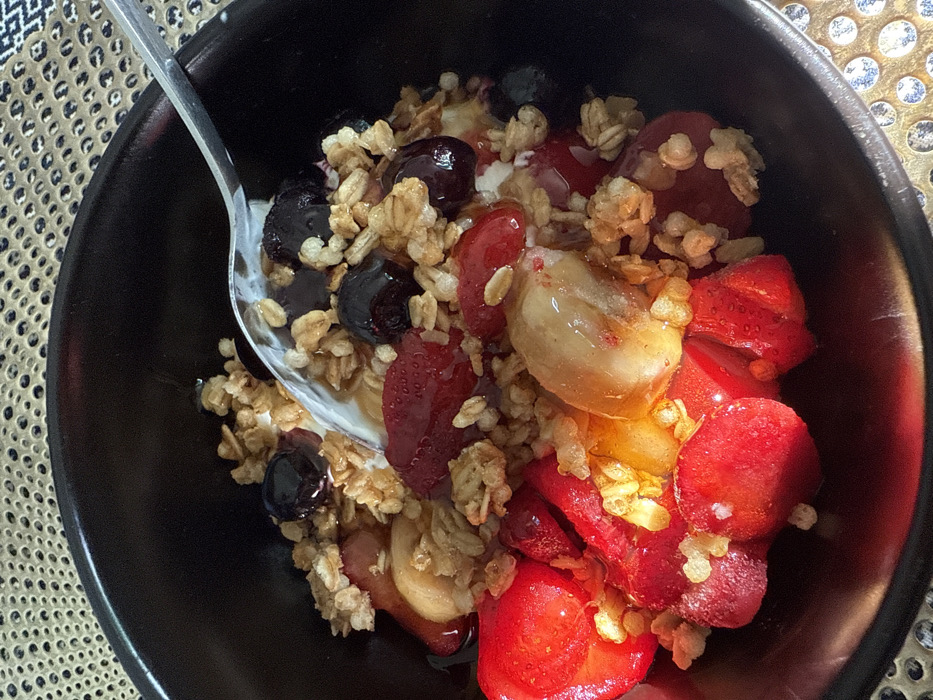 - "The image depicts a close-up, overhead view of a dark-colored bowl containing a mixed breakfast or dessert" by FM-Z4b3e2, licensed under CC BY 4.0