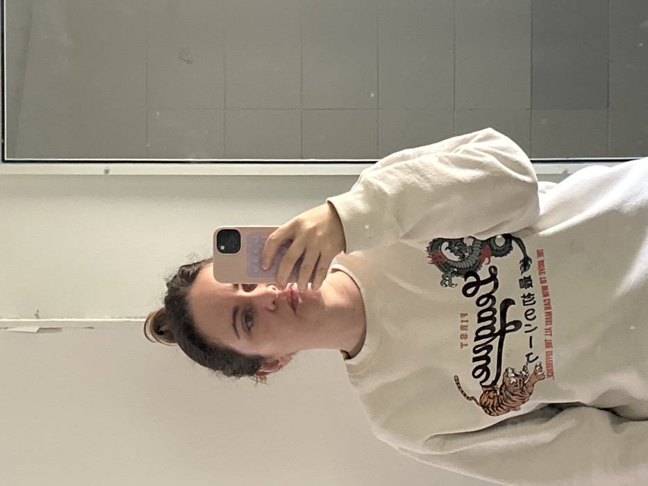 The image displays an indoor scene, stated to be in Tel-Aviv, Israel, captured as a mirror selfie. An adult female, with dark hair pulled into a bun, is visible from the chest up. She presents a neutral expression with slightly pursed lips. Her right hand holds a light pink smartphone, featuring a triple-lens camera array and a light purple pop-it style grip on its back, indicating she is taking the photograph. She is wearing a light-colored, long-sleeved sweatshirt. The sweatshirt's inverted graphic design includes a tiger on the left, a stylized dark script (appearing as "League" when corrected for reflection), and a dragon on the right. Above the script, the word "First" is visible, and beneath it, text reads "THE MODE LO MAN CAN MAKE ALL THE DIFFERENT" along with Japanese characters. The background, observed through the mirror's reflection, consists of a light-colored wall with visible peeling paint along a vertical seam to the left of the subject. To her right, a segment of a bathroom or shower area is visible, featuring gray square tiles on a wall behind a framed glass shower screen.
