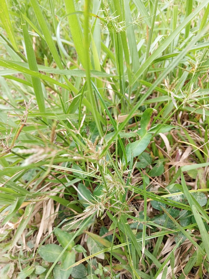 The image displays a close-up, ground-level view of dense, uncultivated vegetation in Thotagamuwa, Sri Lanka. The scene is primarily composed of various green plant species, predominantly tall, linear blades of vibrant green grass. Numerous flowering plants, consistent with sedges, are visible, characterized by star-like clusters of pale green to light brown spikelets. Broader-leafed green weeds are also interspersed throughout the foliage, some partially obscured. Beneath the living vegetation, patches of dried, light brown plant matter are visible. No human or animal subjects are present. The lighting is natural ambient daylight, providing even illumination across the scene.