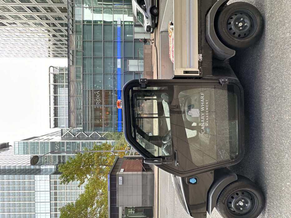 This image captures an urban street scene in Canary Wharf, London, United Kingdom, specifically identifiable by a sign for "CANADA SQUARE 111." The central subject is a dark-colored, two-door electric utility vehicle with an open-top cargo bed, positioned on the left side of an asphalt road. The vehicle's door displays a white "CANARY WHARF MANAGEMENT" logo. An amber rotating beacon is mounted on its roof. The cargo bed contains a rolled-up item, possibly a rug or textile, in shades of red and white. In the mid-ground, a lone individual is visible walking right-to-left on a raised paved area, wearing dark clothing. Partially visible behind and to the right of this pedestrian is the front section of a white cargo van. The background is dominated by multiple modern glass-clad skyscrapers. One prominent building features a visible "ROKA" sign, indicating a restaurant, with a horizontal blue LED display beneath it. To the far left, a small building or entrance structure with a dark roof displays the "CANADA SQUARE 111" sign on its side. Deciduous trees with autumn-colored, yellow-green foliage are present between the foreground and background structures. The sky is overcast.