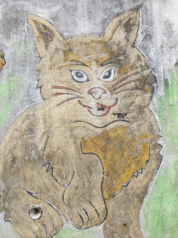 - "The image displays a weathered, hand-painted mural of a stylized cat on a cracked concrete or stucco wall, located in Voa Yeav, Cambodia" by FM-Bc1fy1, licensed under CC BY 4.0