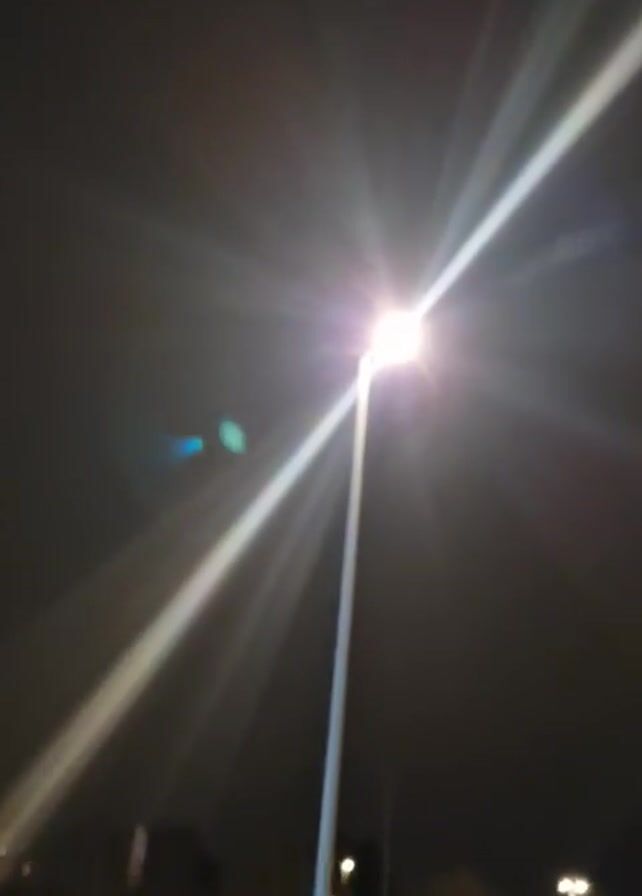 The video, shot at night, focuses on a brightly lit street lamp, producing a strong glare and lens flare