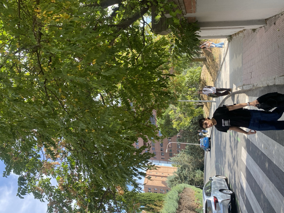 The image displays a daytime urban street scene in Unknown, Unknown, under a partially clear blue sky. A large tree with verdant green and some yellowing foliage dominates the upper frame, casting shadows. In the foreground, a young male, wearing a black t-shirt with a barcode graphic and 'Brügge Made in Europe' text, blue jeans, and a dark backpack, walks across a white-striped pedestrian crosswalk from left to right. He holds a black jacket or bag in his left hand and looks towards his right. To his immediate left, a silver station wagon is positioned on the road, facing away from the viewer. The street, featuring green markings, extends into the mid-ground. A blue hatchback is visible further down the road on the left. Parallel to the road on the right is a concrete sidewalk. Two individuals are present on this sidewalk: one, wearing a white top and backpack, walks away from the viewer; another, further back, is seen bending over or looking downwards. A utility pole stands near the sidewalk. The background reveals several multi-story brick buildings, interspersed with dense green trees and shrubs. A steep, vegetated hillside rises on the left side of the road, while a dirt-covered slope with sparse vegetation ascends from the right side of the sidewalk. A white wall with a red brick capping runs along the far right.