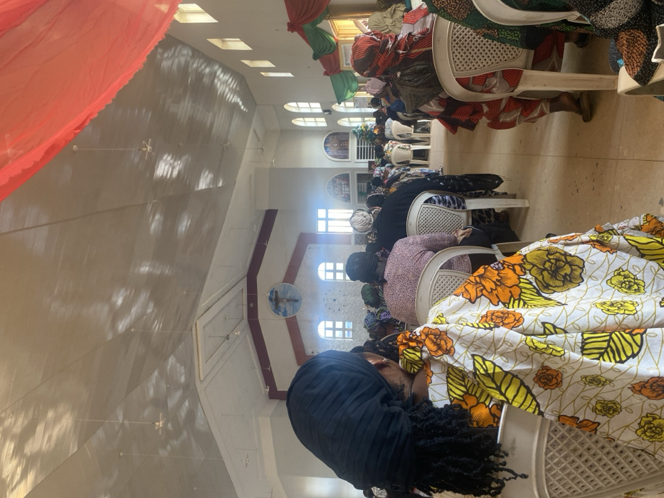 The image captures an indoor gathering, likely a religious service, within a spacious hall in Jos, Nigeria