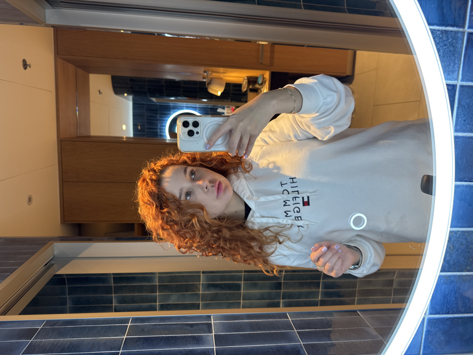 A female with prominent, curly reddish-orange hair is depicted taking a mirror selfie in a modern hotel bathroom in Budapest, Hungary. She gazes directly forward with a neutral expression and slightly parted lips. She wears a white hooded sweatshirt (hoodie) featuring the reversed "TOMMY HILFIGER" logo centrally on the chest over a dark undershirt. Her left hand, adorned with light purple nail polish and a ring on the index finger, is visible in the lower left quadrant of the reflection. Her right hand holds a light-colored smartphone, possibly an iPhone model with multiple cameras, featuring a textured case, positioned to capture the image. A thin bracelet is visible on her right wrist. The circular mirror has an illuminated curved edge and a distinct glowing white ring on its lower left, indicative of a touch control. Dark blue, rectangular tiles are arranged vertically along the wall surrounding the mirror. The background reflected in the mirror reveals light brown wooden panels or cabinetry to the right, which incorporates an additional reflective surface displaying a circular light fixture and a table lamp. The environment suggests a contemporary design with warm artificial lighting.
