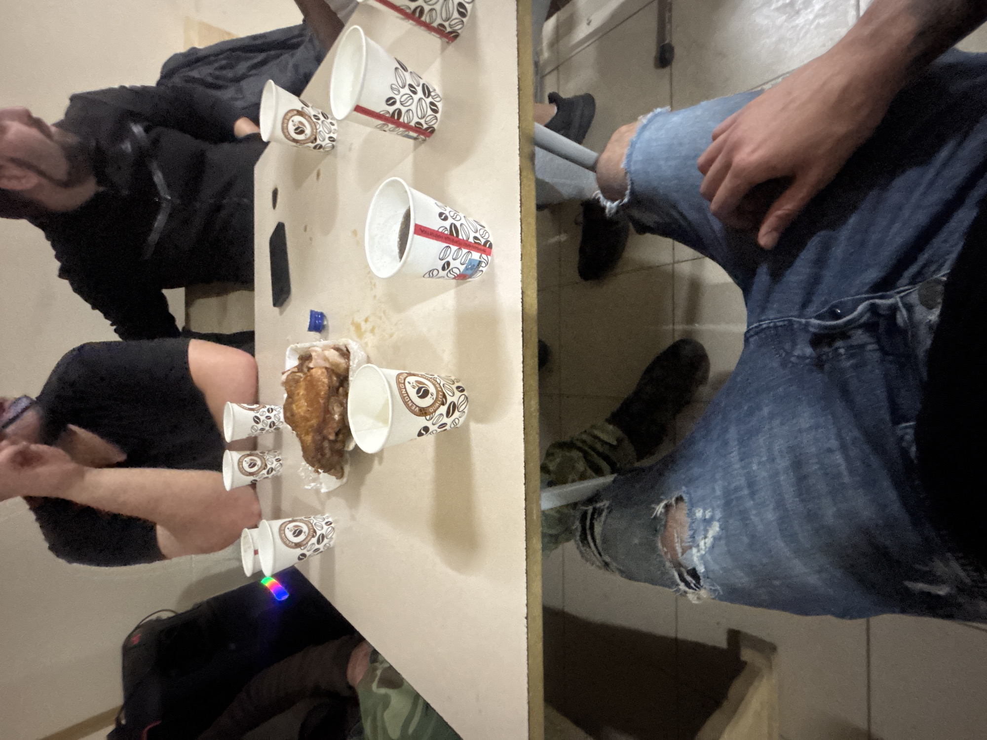 n indoor scene. There is a rectangular table with multiple disposable coffee cups on top, some empty and some seemingly containing liquid. There is also a partially eaten piece of fried food on the table. There are at least two people present. One person is wearing a black hooded sweatshirt and dark pants. The other person is wearing a black shirt and dark shorts. There's a person to the right of the table, wearing ripped blue jeans. The environment looks like an office or break room with beige walls and tile flooring. There is a glimpse of a black backpack and other items under the table. The image does not provide information to determine the location of Chavdar, Bulgaria.