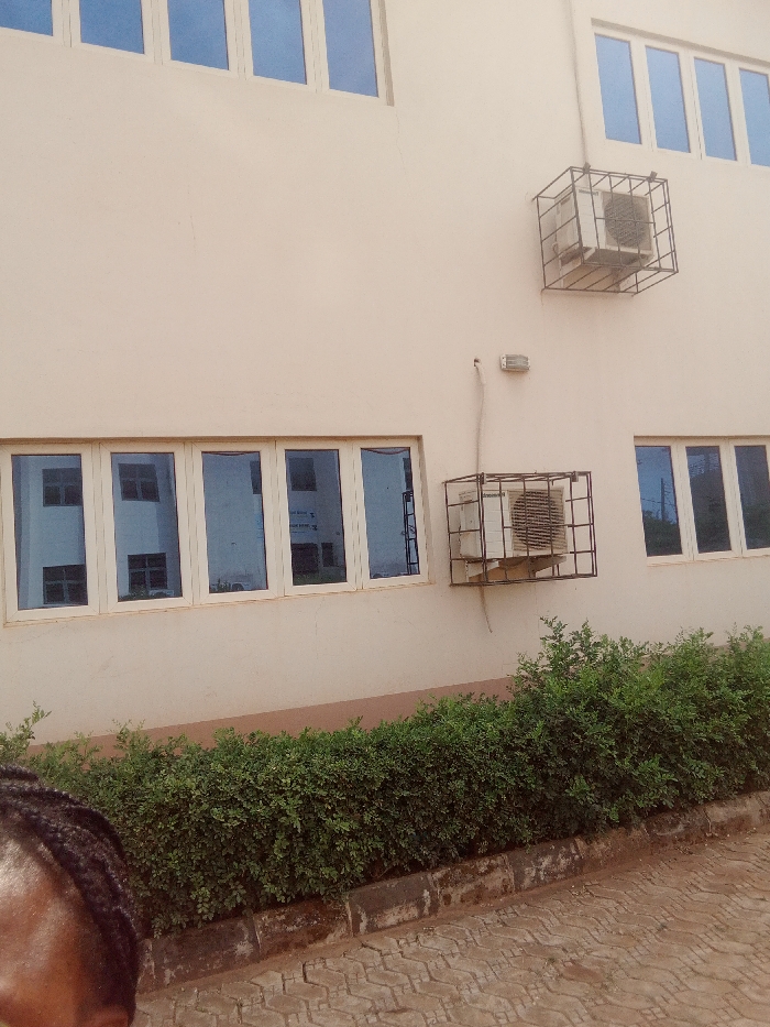 The image depicts a cream-colored building facade located in Nsukka, Nigeria. The building features two distinct rows of rectangular windows with white frames and blue reflective glass. The upper row contains six smaller windows, while the lower row consists of four larger windows. Two outdoor air conditioning units, each secured within a black metal cage, are mounted on the wall; one is positioned above and to the right of the lower window row, and the other is situated between the upper and lower window rows. A wall-mounted light fixture is visible between the two AC units, with an electrical conduit running vertically. A well-maintained green hedge runs along the base of the building, separated from a patterned paved ground by a concrete curb. The lower left corner of the frame includes a partial view of a person's head, showing dark braided hair and forehead, suggesting the image was captured from a ground-level perspective. Reflections of an adjacent building are discernible in the lower windows.