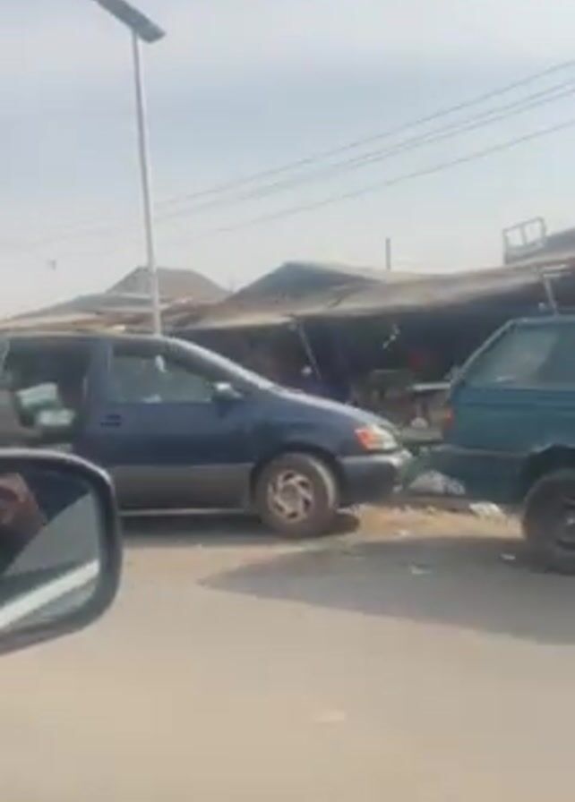 view from inside a car driving on a street in what appears to be an African town. There are various vehicles parked along the road, including a blue station wagon and a dark blue minivan with an open door. A street market is visible on the right side of the road, with people walking around and selling goods. One person in a wheelchair is also visible. A man approaches the car holding up a carton of eggs. The camera captures the reflection of the person recording the video in the side mirror. The sky is overcast.