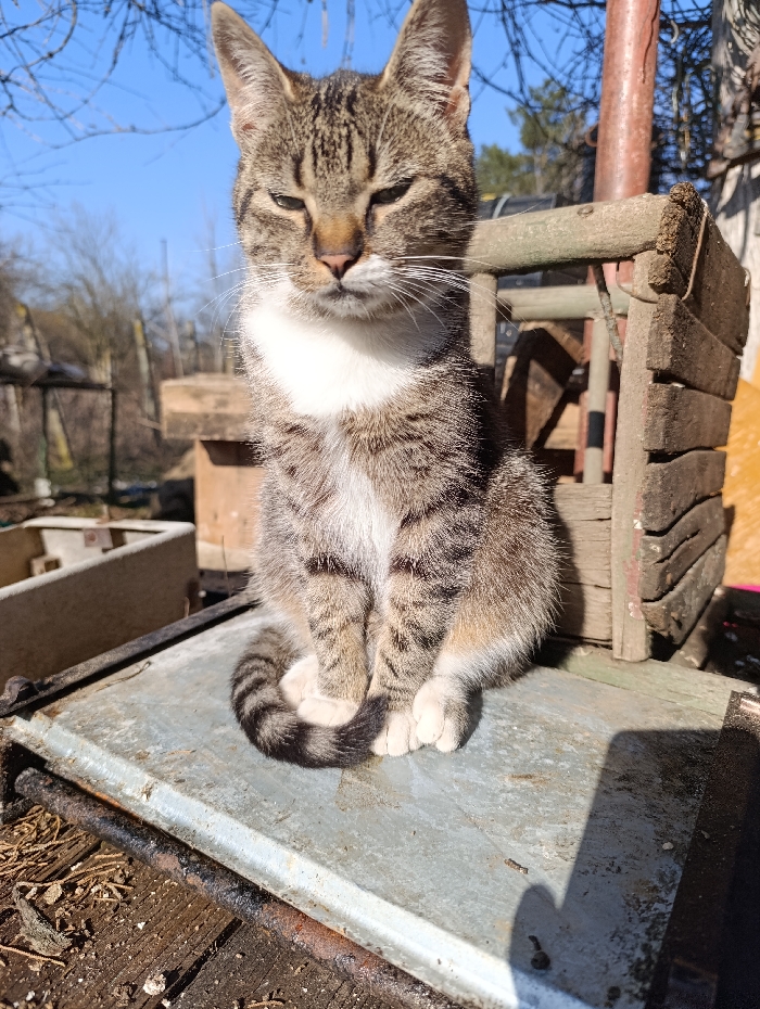 A domestic short-haired cat, displaying a brown and grey tabby pattern with dark stripes, a white bib, and white paws, is seated centrally on a weathered, rectangular metal surface. Its front paws are tucked, and its striped tail is curled around them. The cat's eyes are partially closed. To the right, a small, unfinished wooden structure with visible construction elements is present. The background features bare tree branches against a clear blue sky, a reddish-brown vertical pipe, and blurred details of other structures and dried organic matter on the ground. The scene is brightly illuminated by direct sunlight, casting distinct shadows. The location is Ruptsi, Bulgaria.