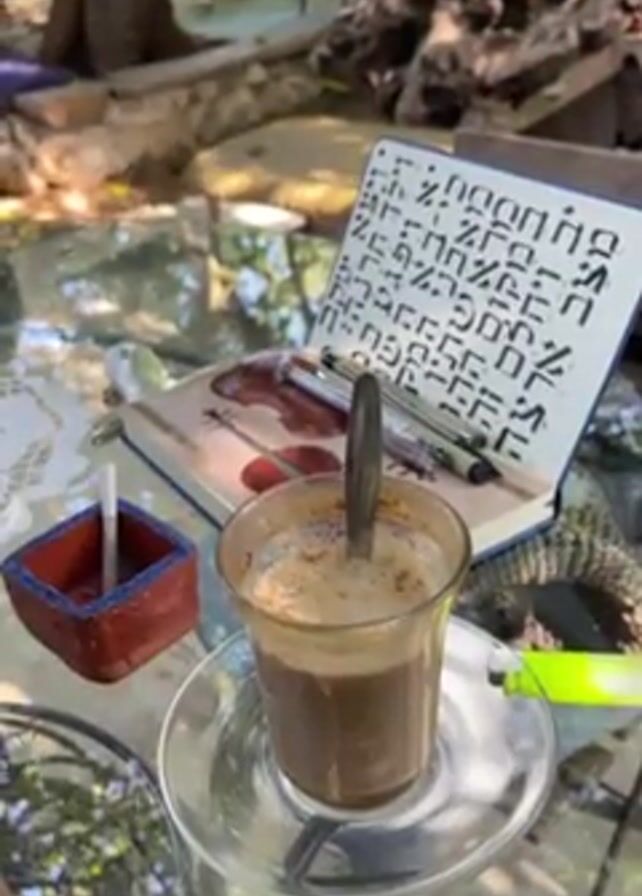 The scene is an outdoor patio cafe on a sunny day. A clear glass table in the foreground holds an espresso in a clear glass, a white cigarette in a small square red ashtray, a notebook with a picture of a violin on it, some pens, and a stencil with block letters. The camera pans upward to reveal the outdoor seating area, where several patrons are sitting and talking at various tables. Trees shade the patio and the sun shines through the leaves.