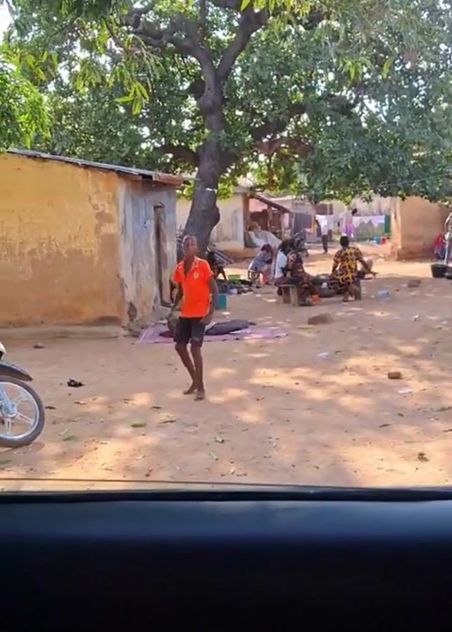 n outdoor scene in what appears to be a rural area. The view is captured from inside a car, looking out through the windshield. In the foreground, a young boy wearing an orange shirt and dark shorts is standing barefoot in a sandy, dirt-covered yard. To his left is a parked motorcycle. Behind him, a large, leafy tree provides shade. Several people are sitting or lying down in the yard, some on benches or mats. There are a few simple buildings with corrugated metal roofs visible in the background. The overall environment suggests a modest, perhaps impoverished, community.