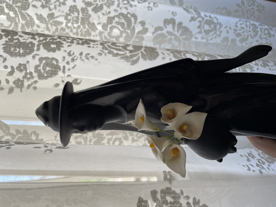 The image depicts an indoor scene within the city of San Sebastián de Aparicio, Mexico, focused on a dark-colored statue of a stylized female figure. The statue, rendered in a matte black finish, is presented in profile, facing left, and wears a broad-brimmed, pointed hat with a flowing veil or cloak that drapes over its head and shoulders. The face is smooth and featureless. The figure holds a small, spherical, dark vase or pot in its left hand, which contains five artificial calla lily flowers. These flowers are white with prominent yellow spadices. A human hand, with light skin tone, is partially visible at the bottom left, seemingly supporting the statue. The background consists of sheer white curtains with a repeating gray floral and foliage pattern, through which diffused natural light is evident, suggesting a window.