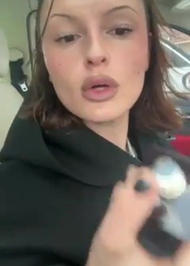 A woman sits in the driver's seat of a car, possibly a Fiat, and sprays perfume on her neck. The car has a sunroof and red trim. She smiles and waves at the camera. The woman is wearing a black hoodie and has sunglasses on her head.