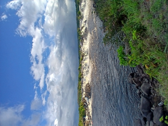 A river scene under a partly cloudy sky. The right side of the riverbank has greenery and rocks. The river itself appears dark, with some areas showing whitewater rapids or a waterfall effect. The sky is predominantly blue with scattered white clouds, but there is also a section of darker, gray clouds. The image is taken from a high vantage point, possibly overlooking the river.