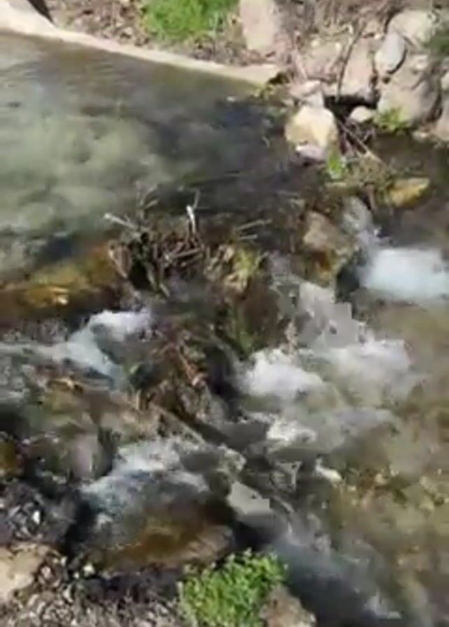 small stream or creek flowing over rocks and vegetation. The water is clear but somewhat turbulent. The stream flows into a concrete culvert or structure in the background. The banks of the stream are rocky and lined with sparse green vegetation. There's some debris in the water, likely leaves and branches. The scene appears to be in a natural or semi-natural setting, with sunlight casting shadows on the water and surrounding area.