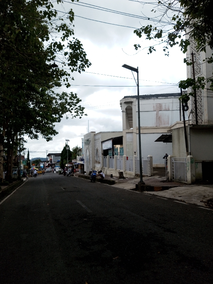 The scene depicts an urban street view in the city of Taohom, Laos, under a heavily overcast sky. A dark asphalt road, displaying minor surface irregularities and a faint white centerline in the distance, extends from the foreground. On the left side, dense green foliage from large trees partially overhangs the road. Further down this side, commercial structures, numerous vehicles including a yellow auto-rickshaw, and pedestrians are visible along the street. On the right side of the road, a multi-story building with a light-colored facade features ornate arched recesses and patterned architectural details. A black, modern-style streetlamp with a rectangular LED fixture is positioned on the sidewalk in front of this building. A white metal fence delineates the building's perimeter from the sidewalk. Two individuals are present on the right sidewalk; one person is crouching or sitting beside a blue motorcycle parked at the curb, and another figure is partially visible further right near a dark utility fixture or basin. The street recedes into the background, flanked by various buildings and utility poles. Vehicular traffic, including multiple cars and motorcycles, is visible. Distant hills or mountains are discernible against the cloudy, grey sky.