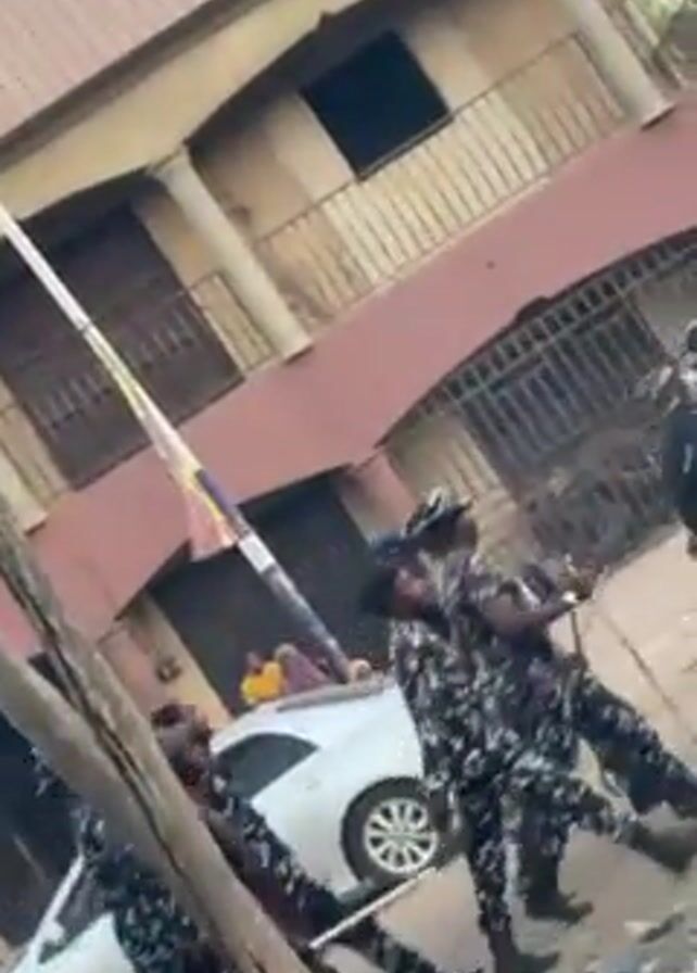 group of uniformed individuals marching down a street. Some wear camouflage-patterned uniforms, while others are in black uniforms. The individuals are marching in formation. A white car is parked on the side of the street. The background includes a two-story building with bars on the windows. A utility pole with multiple lines runs along the sidewalk. The camera angle is slightly tilted, giving a ground-level perspective of the scene. The video seems to be taken in an urban environment.