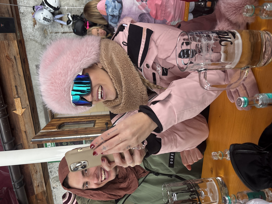 The scene depicts an interior setting, likely a bar or restaurant, in St. Christoph, Austria. Two individuals are seated at a rustic wooden table, engaging with the camera. The central figure is a female with fair skin, wearing a large, light pink faux fur hat, white-framed mirrored ski goggles with blue/green lenses, a brown faux-shearling neck gaiter, and a light pink ski jacket with black accents. She holds a light gold-colored smartphone horizontally with her left hand, which has red painted nails and a small tattoo, and is smiling broadly. To her left is a male with fair skin, wearing a brown head covering and a dark olive green jacket with "DOPE" visible. He is also smiling directly at the camera. On the wooden table, two clear glass beer mugs, partially filled with a light-colored beverage and foam, are visible. Several small clear glass bottles with silver caps and turquoise labels are also scattered on the table, alongside a black glove. In the background, a wooden ceiling beam with an arrow sign pointing left is present, along with a rustic wooden door, a white column, and a textured wall with ski helmets hanging on hooks. Other blurred individuals are partially visible in the background.