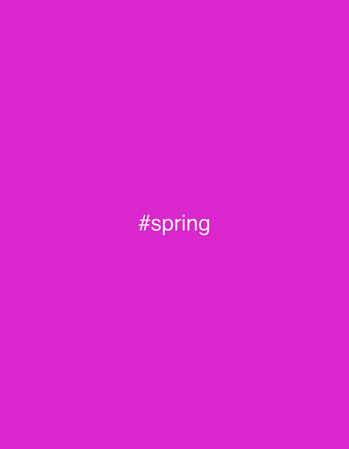 The scene displays a solid magenta field. White text, reading "#spring", is centrally positioned horizontally, slightly above the vertical midpoint of the image. No individuals, discernible objects, actions, interactions, or specific environmental features are depicted. The location is Rusanovo, Russia.