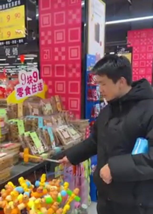 A man in a black jacket is standing in a grocery store aisle. He is holding a yellow and silver toy hammer and hitting it against a metal shelf. The shelf is filled with packages of snacks. There is a sign above the snacks that says "9块9 零食任选" in Chinese characters. In front of the shelf is a basket filled with toy hammers, and the man is standing in front of that basket. The store is well-lit and decorated with red and white patterns.