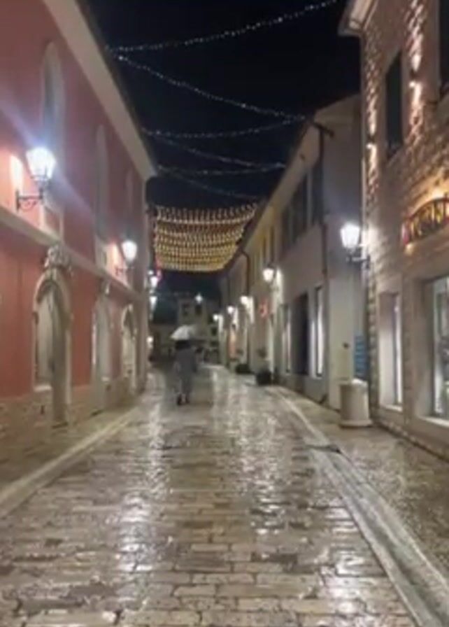 narrow, brick-paved street at night, likely after a rain, as the ground is wet and reflects light. The street is lined with buildings on either side, some painted in light colors and others built with stone. The buildings are adorned with vintage-style street lamps that cast a warm glow. String lights are strung overhead, adding to the illumination. In the foreground, a child wearing a light-colored winter jacket and dark pants walks into the frame, holding the hand of an adult wearing a brown coat. Further down the street, a person with an umbrella walks away from the camera. The scene suggests a quiet evening stroll in a well-lit, possibly European, town.