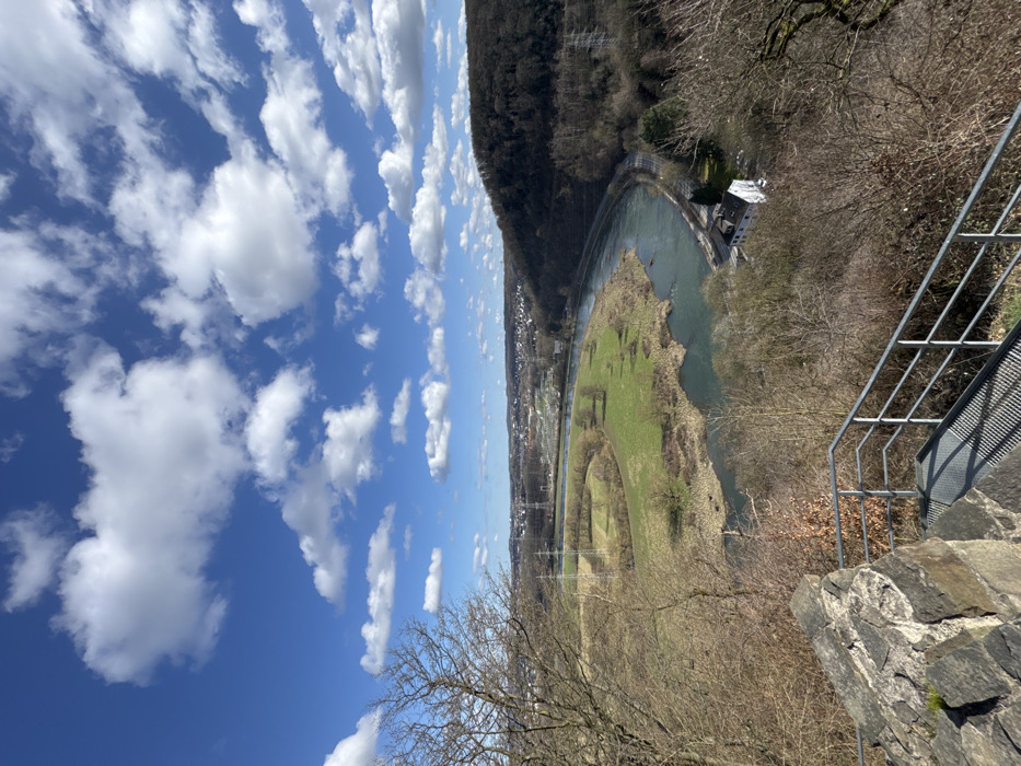 The image depicts a panoramic landscape view over the Ruhr River valley in Hattingen, Germany, from an elevated vantage point. The upper portion features a bright blue sky sparsely populated with white cumulus clouds. In the immediate foreground, to the bottom left, is a partial stone wall fragment, likely part of an observation structure, alongside a metal grated platform and railings descending out of view. Bare, leafless deciduous tree branches frame the left and right sides of the midground. The midground is dominated by a serpentine river, likely the Ruhr, flowing from left to right. On the inner bend of the river, a large, irregularly shaped green field is visible, containing several scattered leafless trees and at least two prominent electricity pylons. Adjacent to the river's outer bend, a railway line runs parallel to the waterway. A distinct white two-story building with a dark roof stands near the river's edge on the forested slope to the right. The background presents a distant urban or suburban area, identified as Hattingen, characterized by various buildings and infrastructure. A distinct area resembling a cemetery or industrial complex with numerous uniform structures is visible near the river in the mid-distance. The valley slopes and surrounding hills are covered with dense, bare deciduous forestation, with additional power lines visible across the landscape. No individuals or active subjects are discernible within the frame.