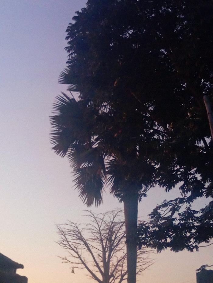 The image displays an outdoor scene in Rafin Par, Nigeria, captured during either dawn or dusk. The sky exhibits a gradient from a light purplish-blue at the top to a faint orange-pink near the horizon. Three primary trees are silhouetted against the sky: a large, dense broadleaf tree occupies the upper right and central-right; a tall palm tree with distinct fan-shaped fronds stands in the center-left; and a bare deciduous tree with intricate, leafless branches is visible behind the palm tree in the lower-left. A small, dark, indeterminate object is suspended from a branch of the bare tree. A dark, angular structure, likely the upper portion of a building, is partially visible in the lower-left corner. A slender, vertical dark element, consistent with a utility pole, is partially visible on the far right edge. No individuals are present.