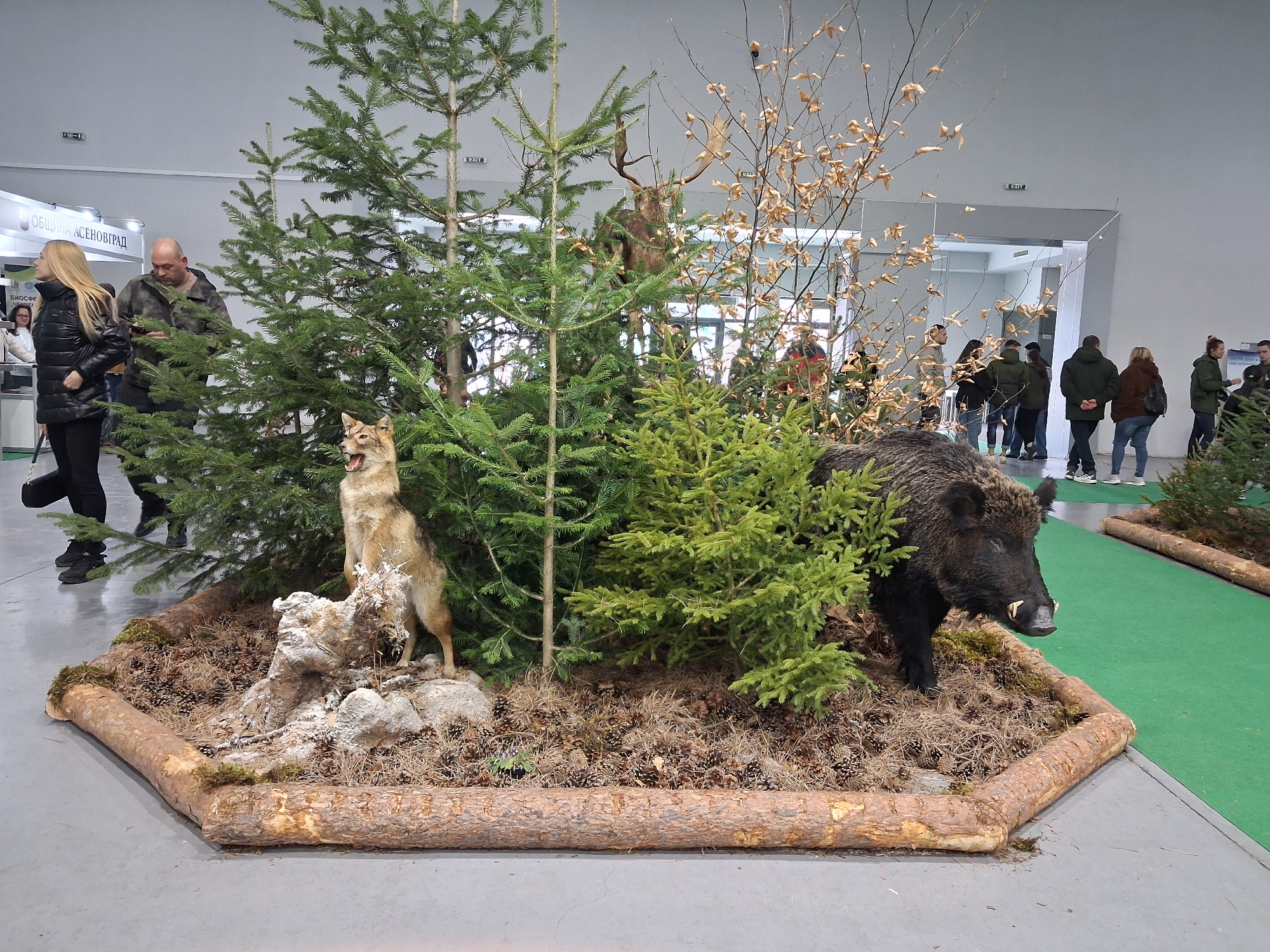 The image depicts an indoor exhibition scene, likely at the International Fair Plovdiv in Plovdiv, Bulgaria. In the foreground and central area, a large, irregularly shaped diorama is presented. This diorama is contained by a border of conifer logs and features several taxidermy animals amidst natural elements. Specifically, a light-colored taxidermy wolf or coyote with an open mouth is positioned standing on a rocky formation to the left side of the diorama. To its right and slightly forward, a dark-furred taxidermy wild boar with visible tusks faces towards the right. Numerous live evergreen trees (fir or pine saplings) of varying heights are planted throughout the diorama, creating a dense, forest-like setting. Bare deciduous branches with dried leaves are also integrated. The ground within the diorama is covered with pinecones, dried needles, and leaf litter. In the mid-ground and background, approximately fifteen individuals are present, standing or walking within the exhibition hall. They are dressed in casual clothing, predominantly winter jackets. To the far left, a white exhibition stand with text including "ОБЩИНА АСЕНОВГРАД" (Municipality of Asenovgrad) in Cyrillic is partially visible. Further back, a taxidermy deer or moose head with prominent antlers is partially obscured by trees. The exhibition space features light grey walls and a light grey concrete floor, with a green carpeted aisle visible to the right of the diorama. Multiple "EXIT" signs are mounted on the walls and above doorways. Overhead artificial lighting illuminates the scene.