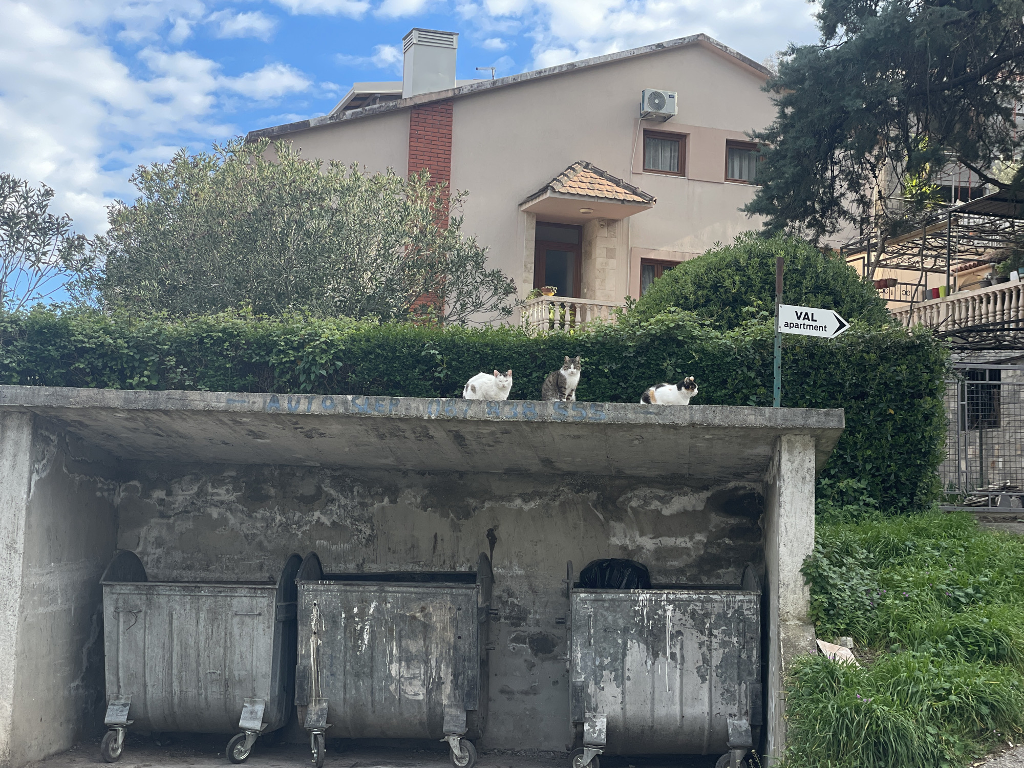 n outdoor scene in the city of Budva, Montenegro. In the foreground, there are three large, weathered metal trash dumpsters positioned underneath a concrete structure, likely a shelter or alcove designed to house the containers. Three cats are perched on top of the concrete structure above the dumpsters. In the background, there is a two-story building with a mix of beige and brick facade, a small balcony, and an air conditioning unit on the upper level. Adjacent to the building is a dense green hedge partially obscuring a sign pointing to "VAL apartment". The scene is partially framed by trees and greenery. The sky is visible in the upper portion of the image with patches of blue sky and scattered clouds.