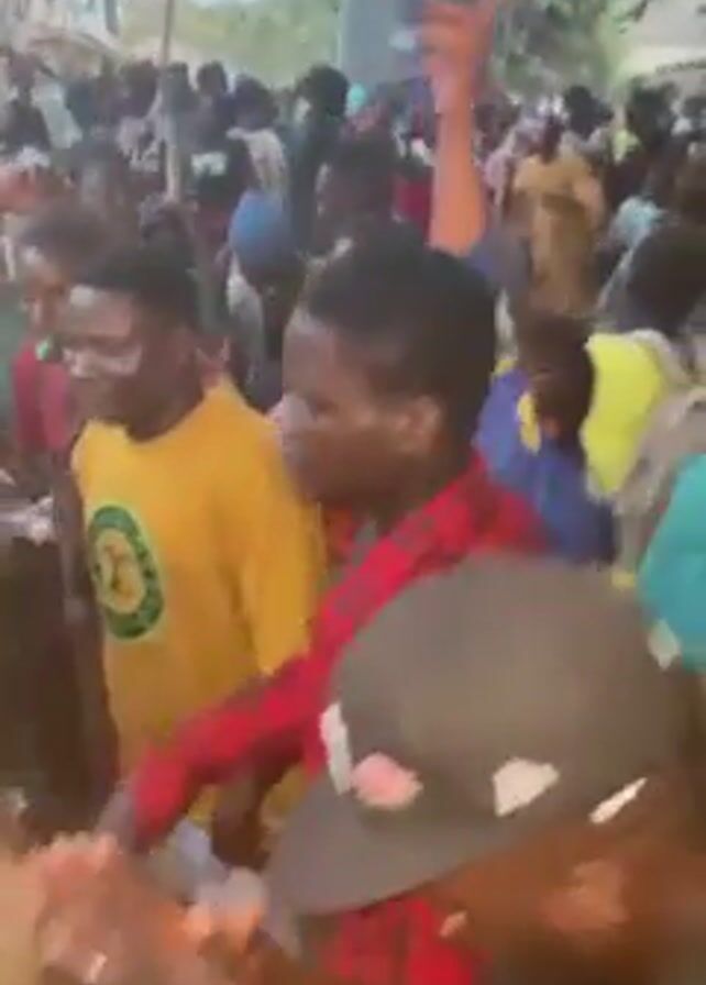 large crowd of people dancing outdoors, with some individuals clapping and appearing to enjoy themselves. The camera moves through the crowd, and one person is playing a drum at the front. The crowd is diverse in terms of clothing, with people wearing yellow shirts, red plaid shirts, and various other colors. A loudspeaker is visible in the background, suggesting music is playing. The setting appears to be an outdoor gathering, likely a celebration or event, under palm trees and other foliage.