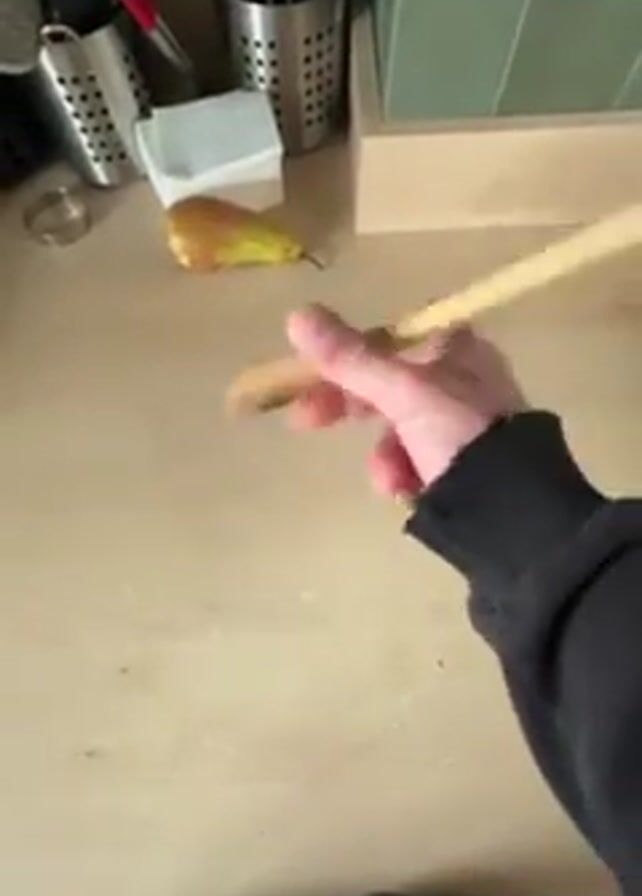 A person is holding a wooden spoon in their right hand. The person is wearing a black sweatshirt with a ripped sleeve. The background is a kitchen countertop. On the countertop, there is a pear, a metal container filled with utensils, and a green tiled wall. The camera angle is slightly high, looking down at the countertop. The spoon is being turned in the person's hand.