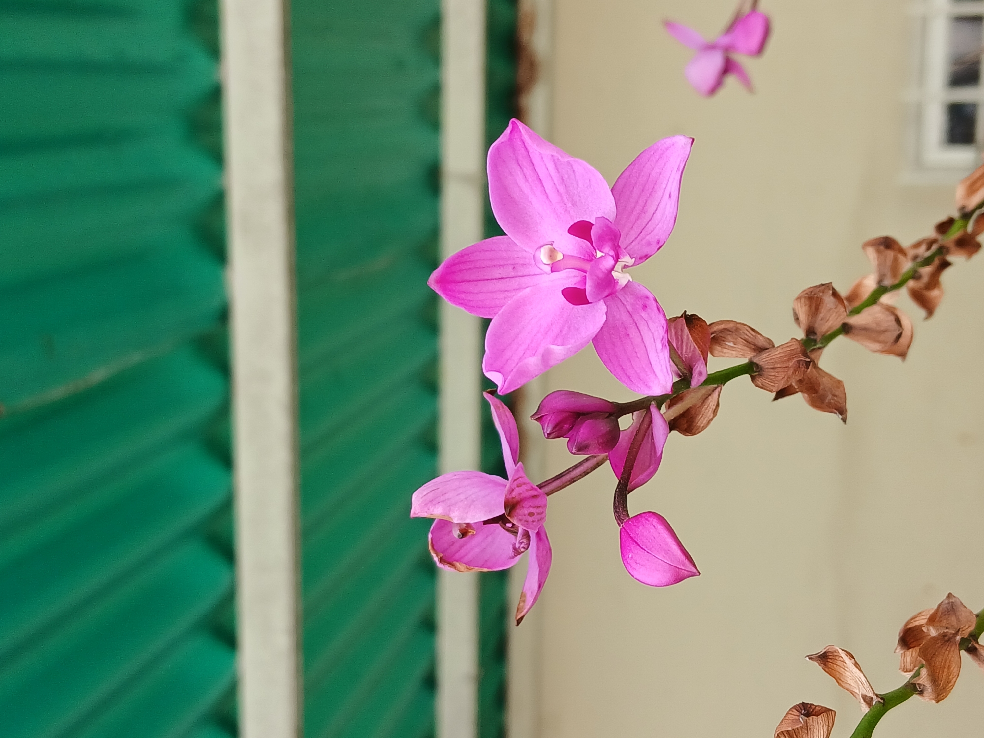A close-up shot features vibrant pink flowers with six petals, situated against a blurred background of a green, slatted wall and a beige wall with a window