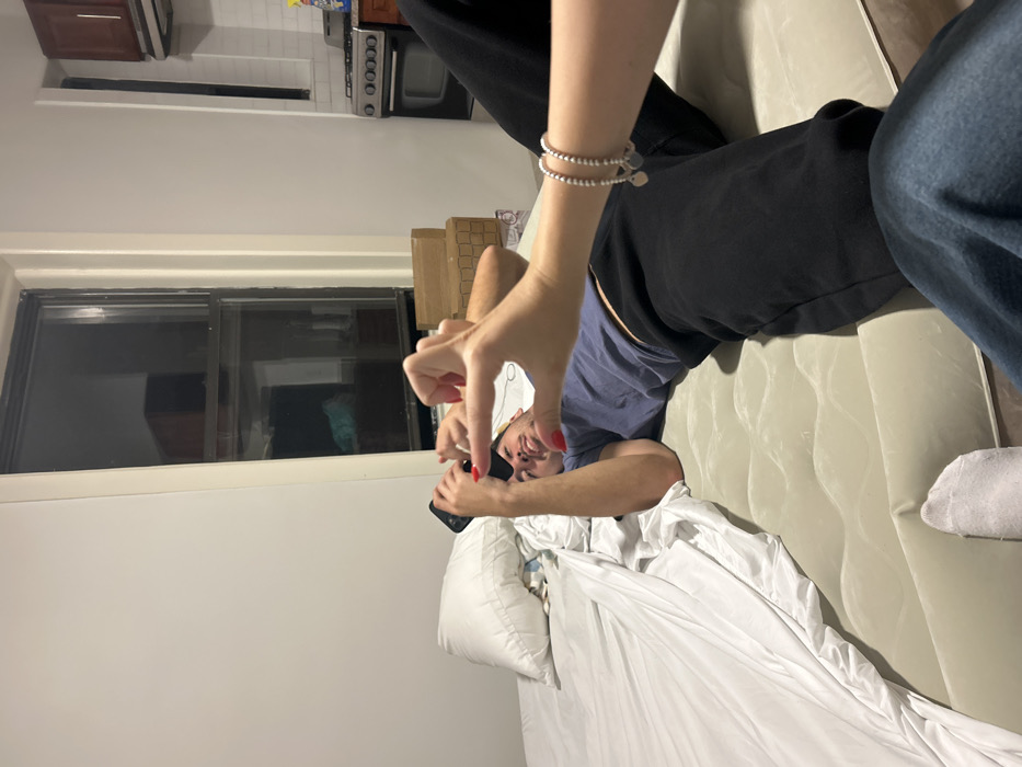 This interior photograph captures two individuals within a compact apartment in New York City, United States, during nighttime. A male subject, with dark hair, a beard, and red nail polish, lies supine on a light gray inflatable mattress. He wears a blue t-shirt and dark sweatpants, holds a dark smartphone in his left hand, and looks towards the camera. In the foreground, the right arm and hand of a second individual, also with red nail polish and wearing two beaded bracelets with charms, extends towards the male, forming a "framing" gesture with her thumb and index finger. A white-socked foot is visible in the lower-left foreground. To the male's left, a white-sheeted bed with a white pillow is present. The background features a large double-hung window reflecting interior elements and a dark exterior. Adjacent to the window on the right, a partial kitchen area is visible, comprising dark wooden upper cabinets, a stainless steel range hood, a gas range with white controls, a white subway tile backsplash, and cleaning products on a countertop. All visible walls are white.
