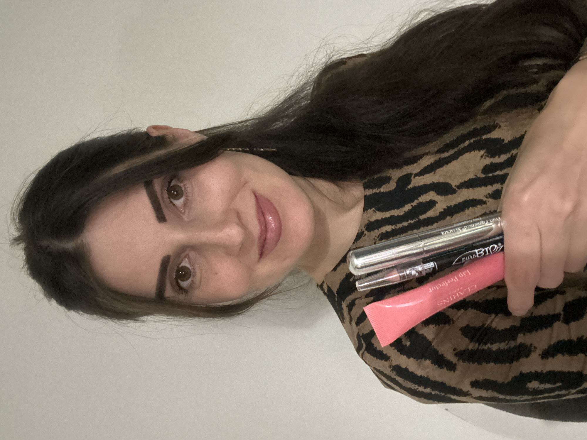 A single adult female is depicted from the chest up, centered in the frame against a plain white background. She has long, dark brown hair parted in the middle, dark eyebrows, and brown eyes. Her lips are a glossy pink, and she exhibits a closed-mouth smile while looking directly at the camera. A small, thin, golden dangle earring is visible on her right ear. She wears a garment with a brown and black animal print pattern. In her left hand, positioned below her chin and extending across her chest area, she holds three cosmetic products. From left to right, these include a pink squeeze tube labeled "CLARINS Lip Perfector," a slender silver-toned tube with a black element, and a thicker silver-toned tube with a clear section and partial black text including "BIO." The setting is an interior space with an unadorned white wall; no specific details are present to identify a location within the city of Wisła, Poland.