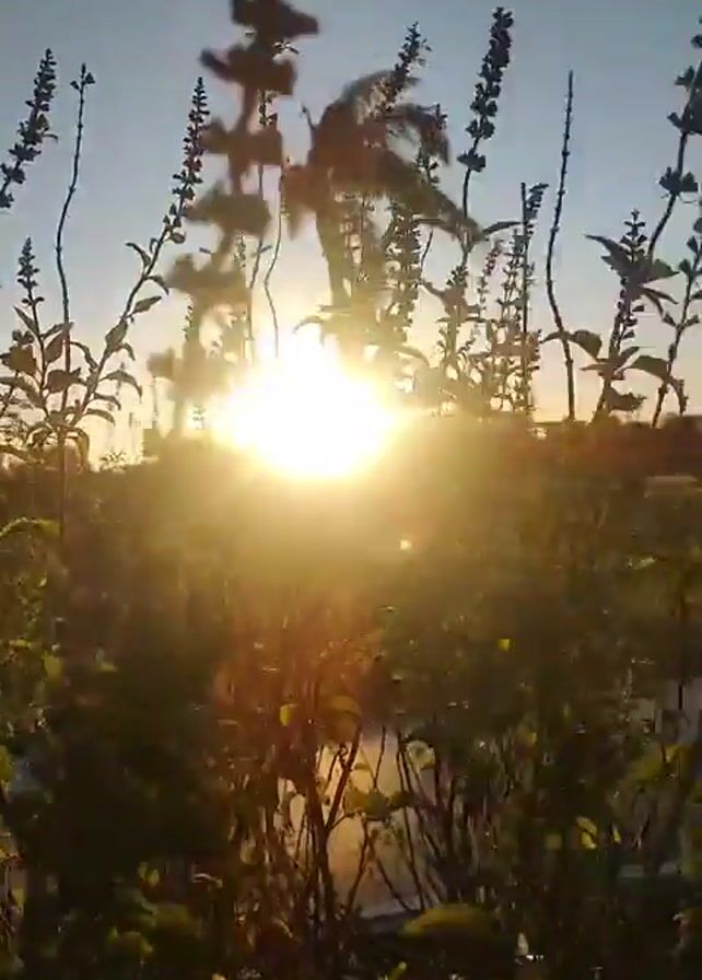 sun rising or setting behind some tall plants with thin, dark flower stalks. The sky is a clear blue. The sun is bright, creating a strong backlight effect. Some buildings and a palm tree can be seen in the distance. The camera appears to be hand-held and at ground level. There are some indistinct people in the background.