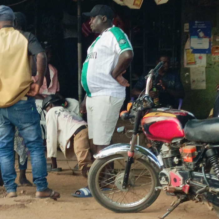 The scene depicts an outdoor gathering in Shendam, Nigeria, in what appears to be a commercial or street environment with a building entrance in the background. In the right foreground, a black motorcycle with a red and yellow fuel tank, chrome front fender, and a black seat is parked on a kickstand, facing left. Multiple individuals are present. In the mid-ground, a man of large build stands facing right in profile, wearing a white and green vertically striped short-sleeved shirt, white shorts, a black baseball cap, and blue flip-flops. His hands are placed on his hips. To his left and slightly behind, a person in a light-colored long-sleeved shirt with graphics and brown pants is leaning forward or stooping. To the far left, a man is seen from the back, wearing a tan sleeveless top over a dark shirt, blue jeans, and brown sandals. In the dark background, within the visible entrance of a structure, a man is seated, holding a bottle. The building's exterior wall to the right of the entrance has several papers or posters taped to it. The ground surface is unpaved dirt. Overhead, a light-colored awning or tarp is partially visible. The lighting suggests daylight conditions, with some areas in shadow.