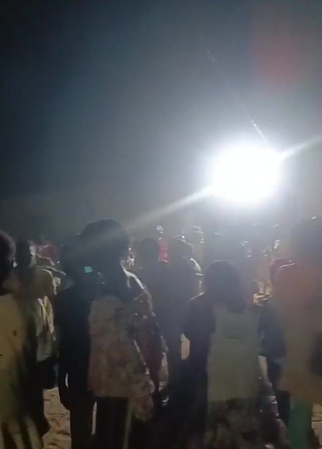 crowd of people gathered outdoors at night, illuminated by a bright light source. The individuals in the crowd are mostly dark silhouettes, making it difficult to discern specific details about their appearance or actions. The light source is intense, creating a strong contrast between the brightly lit area and the surrounding darkness. The atmosphere appears lively, though the specific reason for the gathering is not evident from the video.