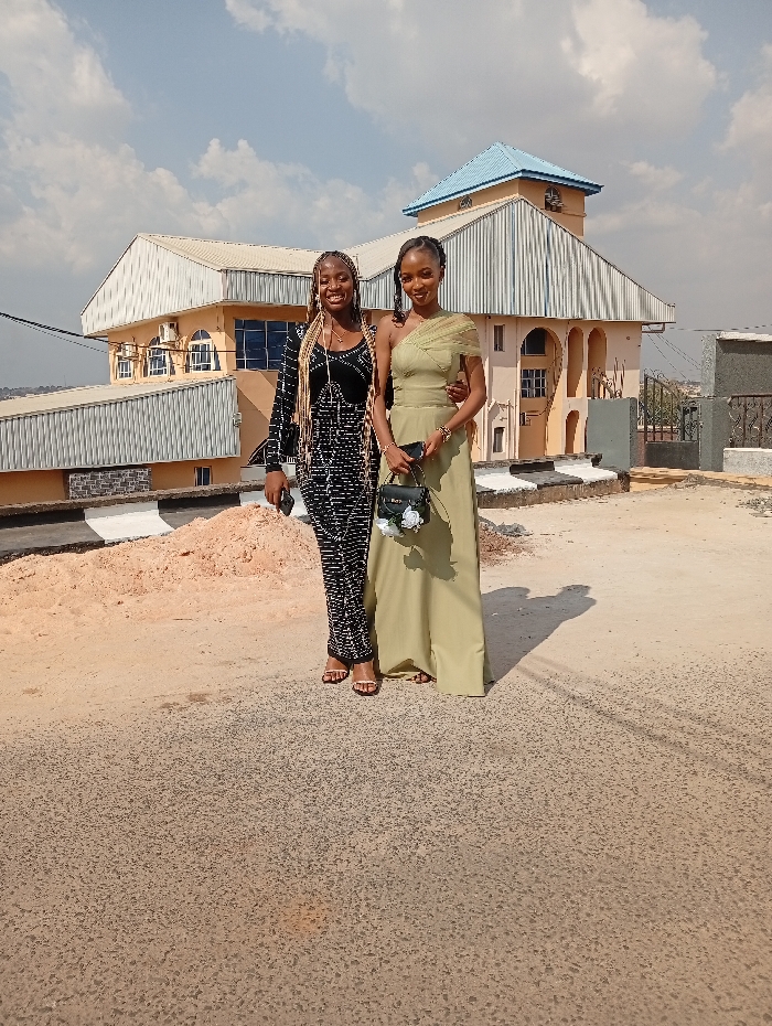 Two young adult females are shown standing outdoors on a paved surface under a partly cloudy blue sky in the city of Enugu, Nigeria