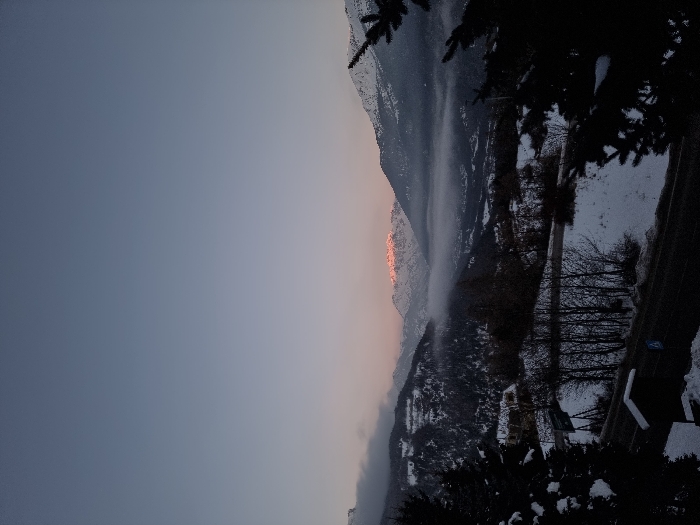 A mountain range with snow is bathed in the light of dusk. The horizon is a gradient of grays and pinks. A road curves alongside the mountains, framed by silhouetted trees. The foreground is blurred with shadows and patches of snow. The overall scene evokes a sense of serene isolation and natural beauty.