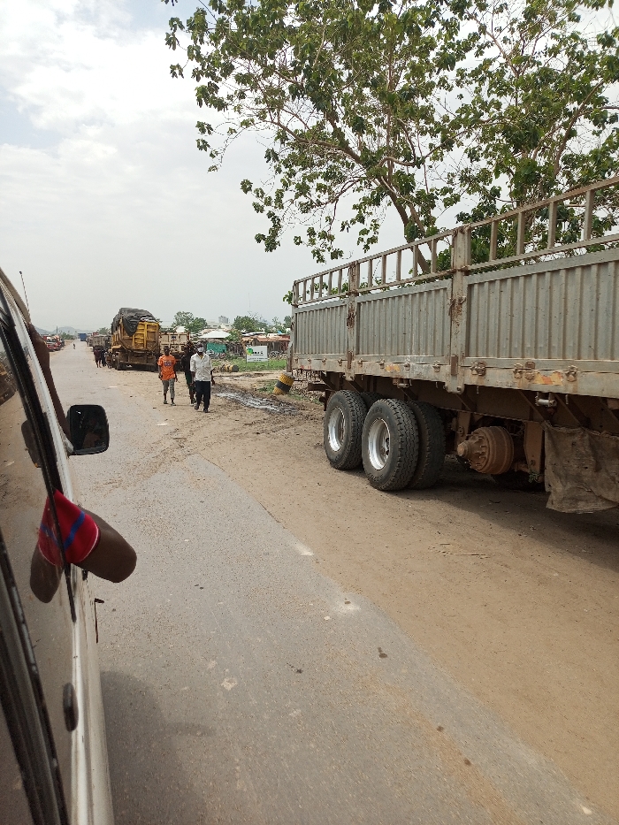 dirt road in Ohunene, Nigeria, with a large semi-trailer truck parked on the right side of the road. There are two people walking on the road in the distance. The image is taken from the driver's seat of a vehicle. The scene is on a sunny day and there is a large tree in the background. The road is dusty and there is a ditch on the right side of the road. The truck is loaded with what appears to be construction materials. The people are walking towards the camera. The image appears to have been captured by someone riding in a vehicle, as the camera is pointed towards the road in front of the vehicle. There are other vehicles visible on the road in the distance, some of them are loaded with goods.